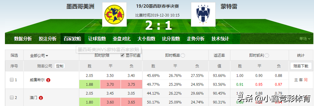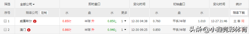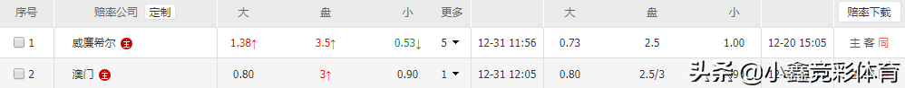 盘口 :又称亚盘,也就是让球。亚盘给我们的信息量要远大于欧赔,难度自然也高。亚盘博大精深,以后会详细讲解每个盘口。一般看澳门就行,别的也可以参考。亚盘盘口