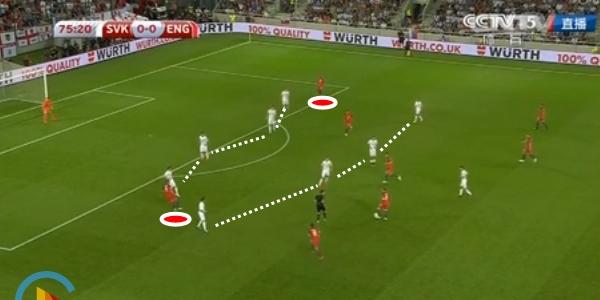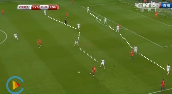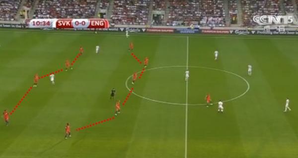 在被罚下一人后,斯洛伐克的队形变成了441,与之前的541相比,他们在两翼的防守宽度大大减弱,英格兰球员开始频繁地对斯洛伐克4后卫防线的两翼发动攻击。