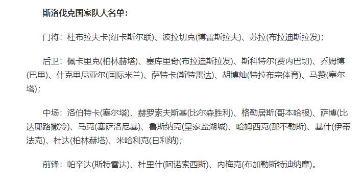 防守强悍、领导力出色的前利物浦后防大将斯科特尔和那不勒斯队史进球第二多,且效力过中超大连人的哈姆西克是球迷们耳熟能详的名字。如今的斯洛伐克队,你可能无法立刻想起哪位球星的名字,但你只要翻看球队大名单,马上就会找到一长串熟悉的身影。