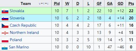 随后的捷克,尽管奋起直追,并且在2009年9月客场2-2逼平了斯洛伐克。但是,他们未能最后时刻完成逆袭甚至是一张附加赛门票。最终,本组斯洛伐克拿到了直接晋级南非世界杯的门票,斯洛文尼亚拿到了附加赛的名额,并最终淘汰俄罗斯晋级世界杯。捷克足球的黄金一代中的扬库洛夫斯基,在这届世界杯预选赛中完成了国家队的谢幕。