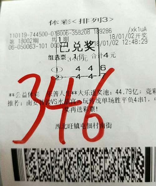 排列3游戏一共有直选和组选两类玩法,直选玩法的单注奖金为1040元;而组选又包括组选3和组选6两种玩法:组选3的单注奖金为346元,组选6的单注奖金为173元。从票面上看,这位彩友投注的是第18002期,选择了单式两注投注方式,2注号码分别为446和447。当晚,排列3开出奖号644。该彩友的第1注号码如愿击中了组选3奖项,揽奖346元。(★中奖票样见图1)
