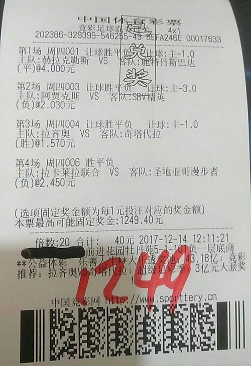 2017年12月14日,还是在顺义区I智慧竞彩店,一彩友投注竞彩足球混合过关4串1,倍投20倍,投入40元,中奖1249元,回报31倍。