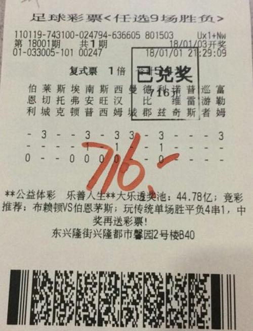 今年1月3日,足彩第18001期开奖后,一张任选9场“红单”在位于东城区东兴隆街都市馨园小区2号楼B40号的第33005体彩店诞生了。中奖者戴先生以一张54元小复式票拿下716元奖金,赚取13倍回报,喜迎2018年“开门红”。