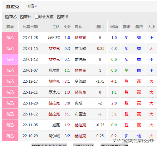 赫拉克 近10场战绩5胜1平4负进24球失13球