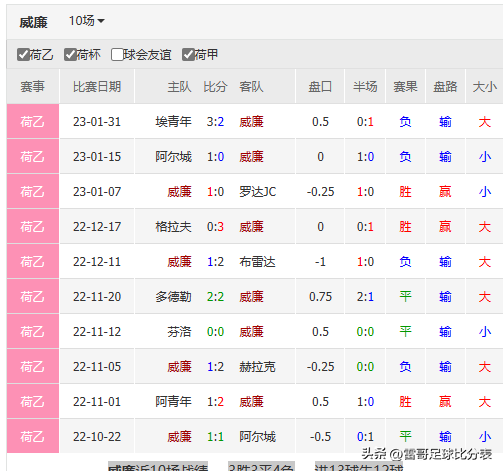 威廉 近10场战绩3胜3平4负进13球失12球