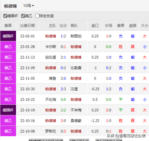 帕德博 近10场战绩3胜2平5负进13球失14球
