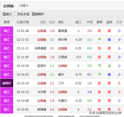 达姆施 近10场战绩7胜3平0负进14球失6球