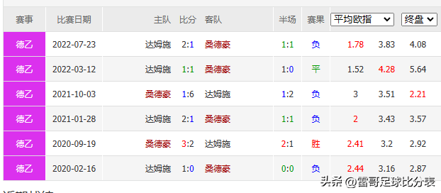 双方近6次交战,桑德豪1胜1平4负 ,进7球,失14球,大球4次,小球2次