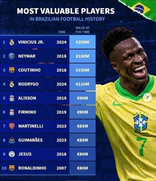 巴西球员历史身价榜:维尼修斯2亿欧居首,内马尔第二、小罗第十