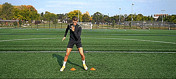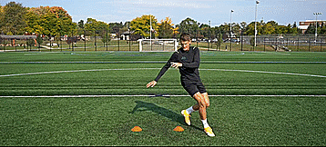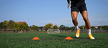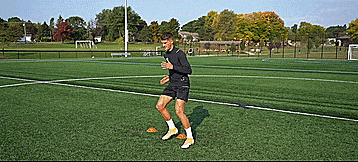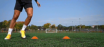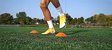 在做这个训练的时候我们要注意后面的标志盘,确保不碰到它,然后随着自信的增加,速度逐渐加快,重复4次,做10秒休息10秒,要确保每次都要换主导腿,如果第一次是右脚主导,接下来就要左脚主导,如此反复。