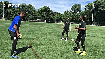 如果有朋友,我们可以去球场和他们一起训练。由队友抛球,我们要在空中将球接住,并踢回去,就像下面这样,但是我们不能始终站在原地训练,这不符合比赛实际。