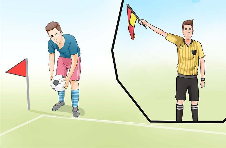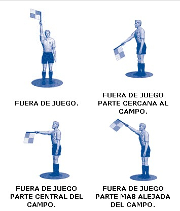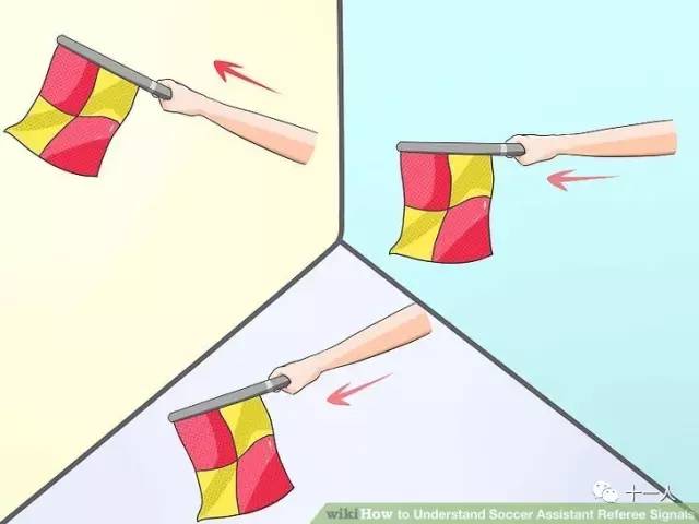 最常见的越位举旗方法是举过头顶(下图左上)。不过也可以通过上,中(平行),下不同的举旗位置告知主裁判越位的具体方位。