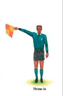 足球比赛边裁的旗语包含对于角球,界外球,越位和犯规四项内容的示意。判罚角球时,旗子指向角旗区;判罚界外球时,指向获得球权队伍进攻的方向;越位时,将旗子举在面前;犯规时,将旗子指向身体斜上方。