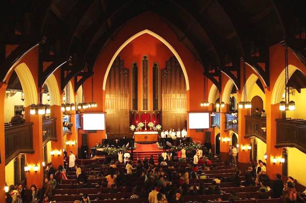 上海国际礼拜堂(新教)内景(可见无表现人或动物形象的雕塑与绘画)