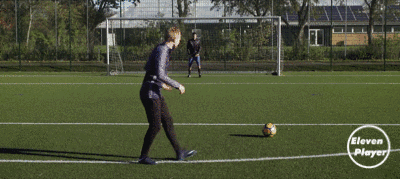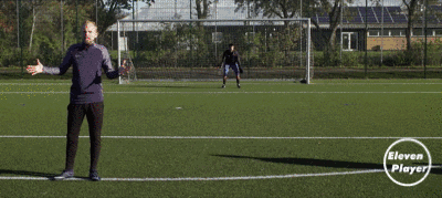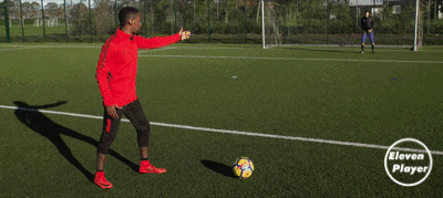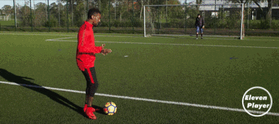 先轻拨一下皮球我们看到门将靠近这一侧的门柱,这可能意味着我们将会把球打向远门柱。
