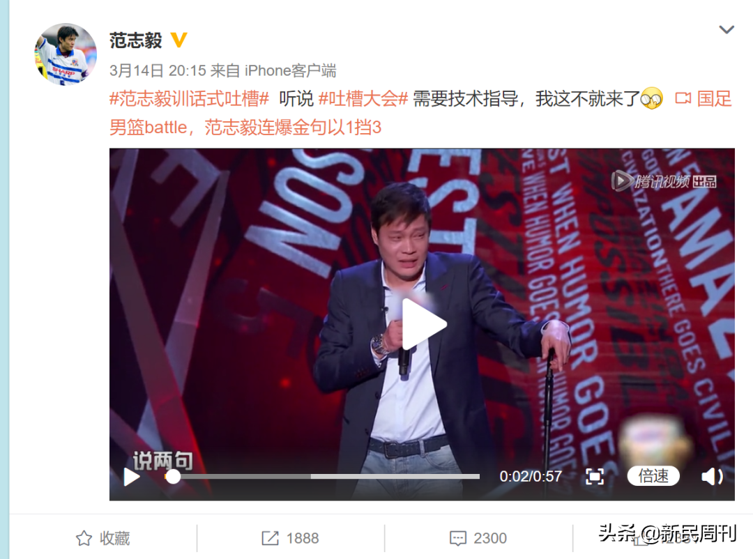 当晚,范志毅也在自己的微博上调皮了一把:听说吐槽大会需要技术指导,我这不就来了。还附上了当期节目的短视频,赢来12000多点赞和2300多条评论。