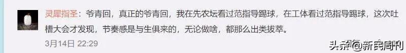 还有老球迷留言:爷青回,真正的爷青回,我在先农坛看过范指导踢球,在工体看过范指导踢球,这次吐槽大会才发现,节奏感是与生俱来的,无论做啥,都那么出类拔萃。
