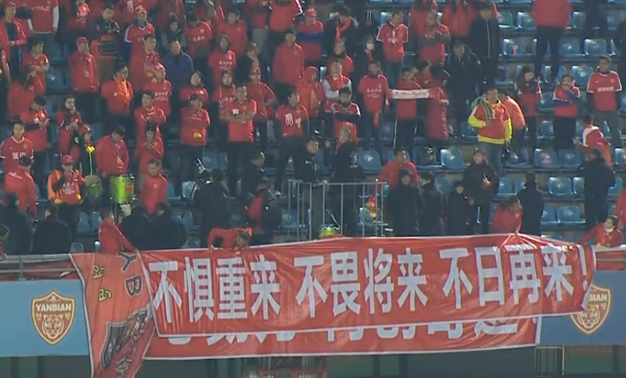 延边的球迷们打出了“不惧重来 不畏将来 不日再来”的横幅,2015年的中甲联赛,延边足球队以替补参赛的身份上演了逆袭最终拿到了中甲冠军成功升入中超联赛,2016赛季,延边富德的表现令全国球迷都大为盛赞,在主场他们多次击败强敌,凭借在主场的彪悍战绩,延边最终以中超第9名的身份成功保级。
