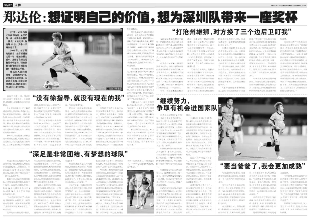无论在上海、天津还是在深圳队,队友们形容郑达伦时,都爱用“硬朗”一词。今年中超联赛上有两个难忘的镜头——深足第二回合对广州队的比赛,郑达伦打进了第一个球,最后深足战胜了广州队;另外一场是深足对阵沧州雄狮的比赛,深足在第80分钟还0比1落后,郑达伦出场后为深足创造了一个点球,卡尔德克打进点球将比分扳平。两场重要的比赛,郑达伦都发挥出了很高的水平,球场“硬汉”形象很鲜明。