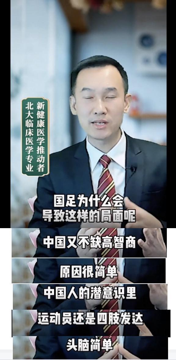 “国足为什么会导致这样的局面了?中国又不缺高智商,为什么就不能培养出一批高智商的足球运动员了?原因很简单,中国人的潜意识里,运动员还是头脑简单、四肢发达”。正是这种潜意识,导致了中国男足踢球的,基本都是智商不行的球员。