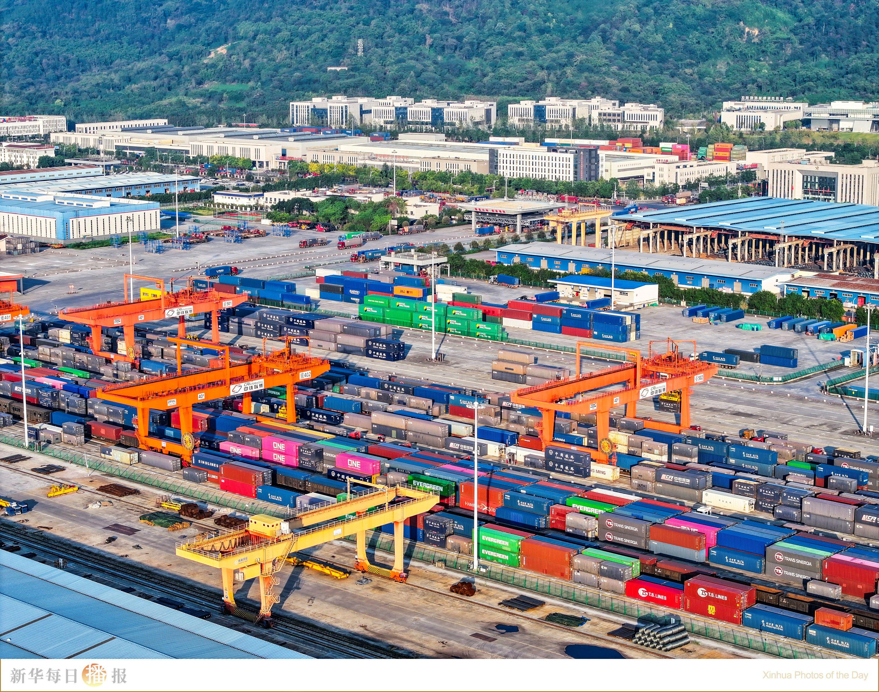 近年来,重庆着力打造内陆开放综合枢纽。重庆国际物流枢纽园区是中欧班列始发地、西部陆海新通道策源地(无人机照片)。园区目前已开通班列线路62条,通达全球125个国家和地区的542个港口,成为我国南向西向高水平对外开放的重要枢纽。