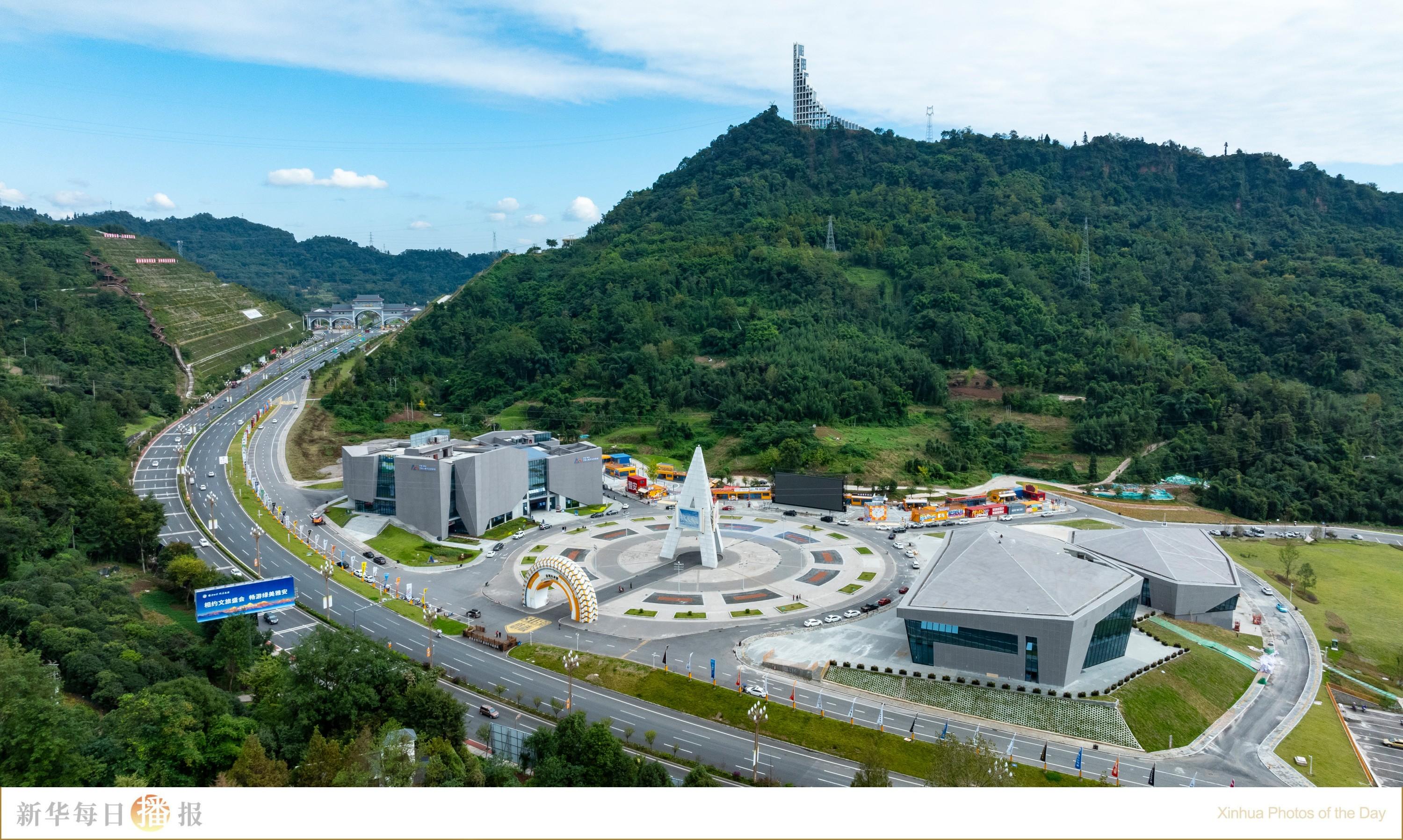 10月27日拍摄的“中国·雅安318自驾大本营”(无人机照片)。近年来,川藏公路的动工地雅安市大力发展文旅产业,相继建设“中国·雅安318自驾大本营”、“川藏线第一桥”飞仙关桥驿站、天全服务区等文旅地标,进一步推进当地“交旅融合”发展。