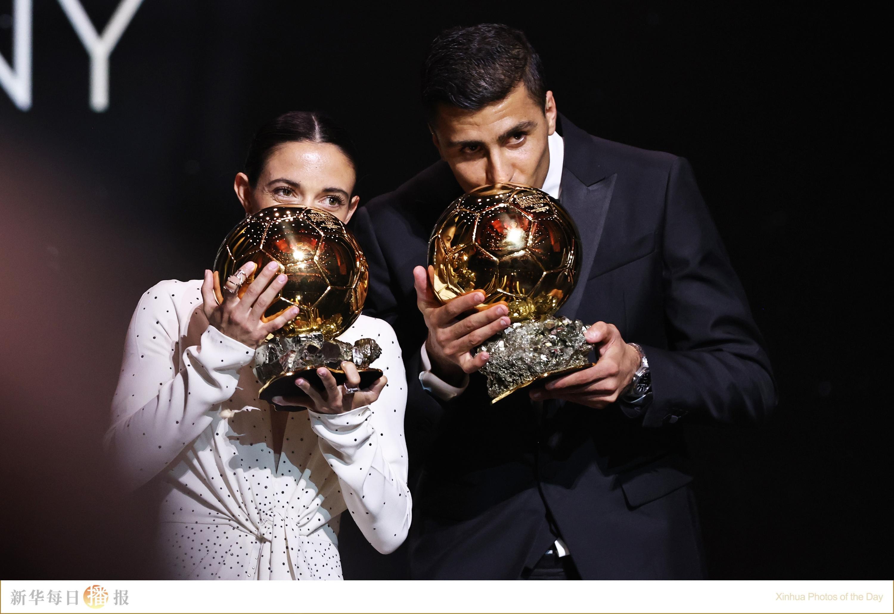 10月28日,男子金球奖获得者罗德里(右)和女子金球奖获得者邦马蒂在颁奖典礼上亲吻奖杯。当日,一年一度的金球奖颁奖典礼在巴黎夏特莱剧院举行,西班牙足球成为当晚的最大赢家——罗德里与邦马蒂分别荣获男、女足金球奖,17岁的亚马尔则摘得象征最佳年轻球员的“科帕奖”。