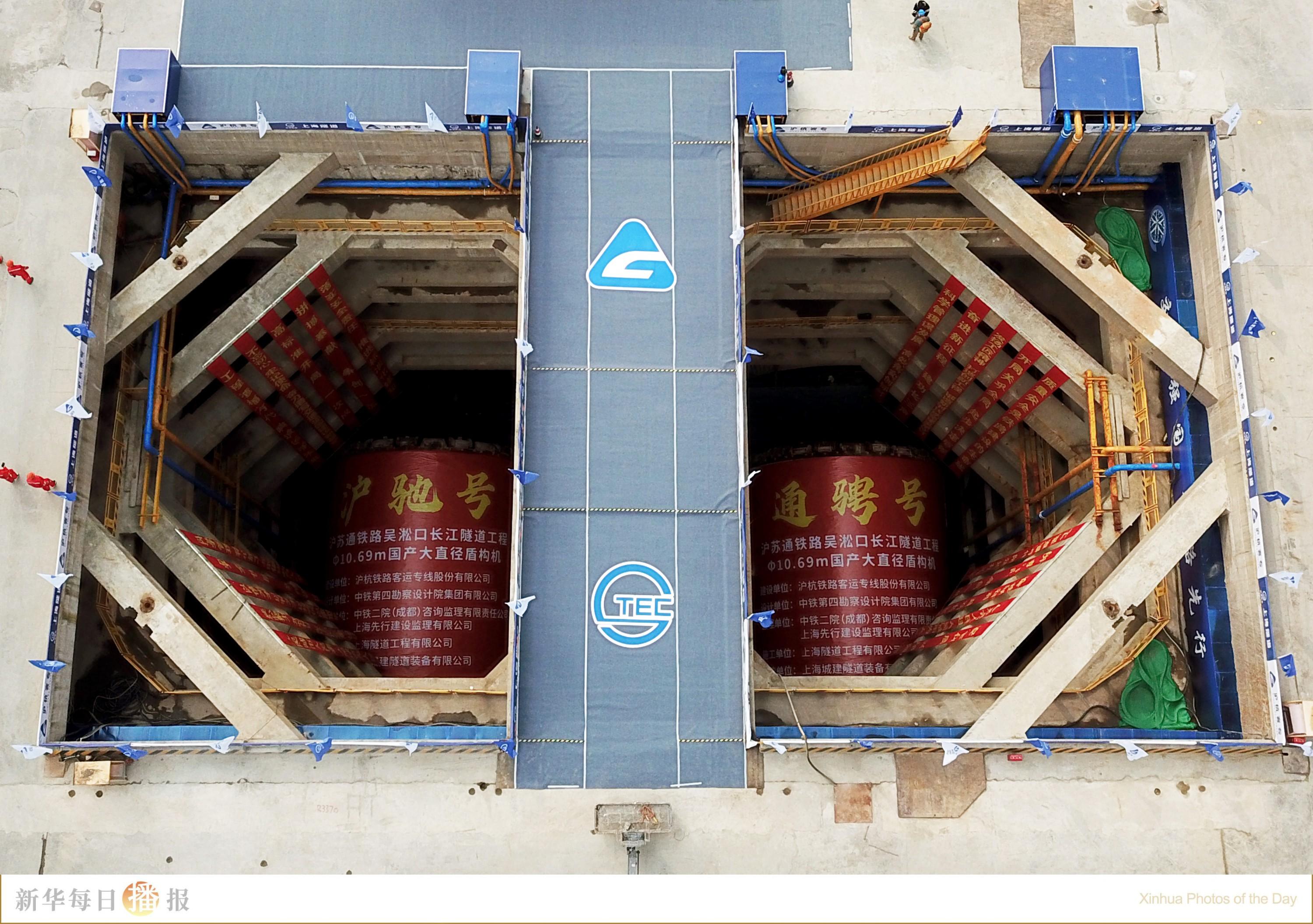 10月28日,两台国产10.69米大直径泥水气平衡盾构机“沪驰号”“通骋号”抵达位于上海宝山区的接收井(无人机照片)。至此,沪苏通铁路太仓至四团段吴淞口长江隧道越江段实现双线贯通。沪苏通铁路太仓至四团段主要承担上海、苏南与苏北地区城际旅客交流,同时兼顾货物运输功能。