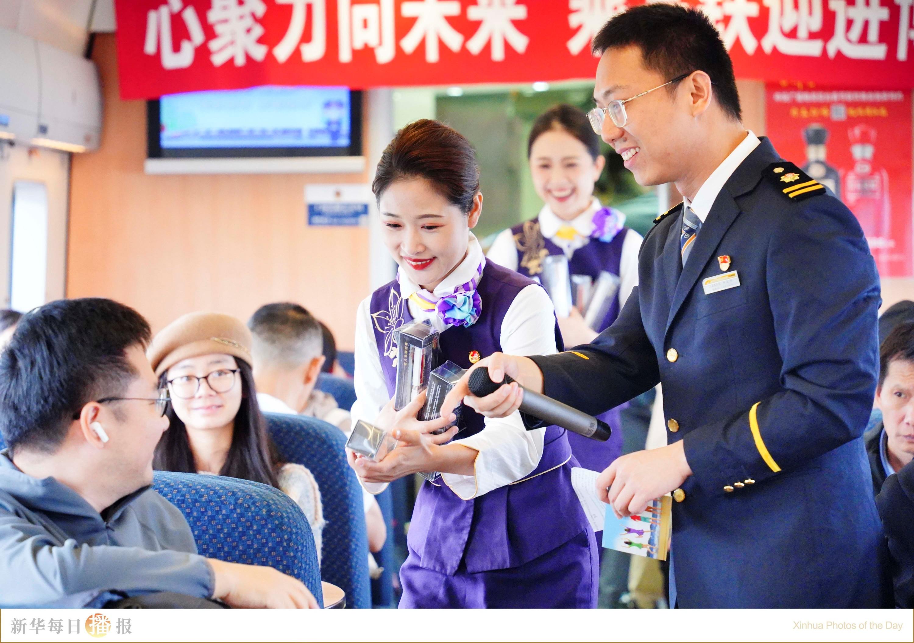 10月28日,旅客在车厢内抢答进博会相关知识。第七届中国国际进口博览会开幕在即,当日,铁路上海客运段在D3205次列车上开展“心聚力向未来 乘高铁迎进博”主题活动,向旅客介绍进博会亮点,为进博会送上祝福。