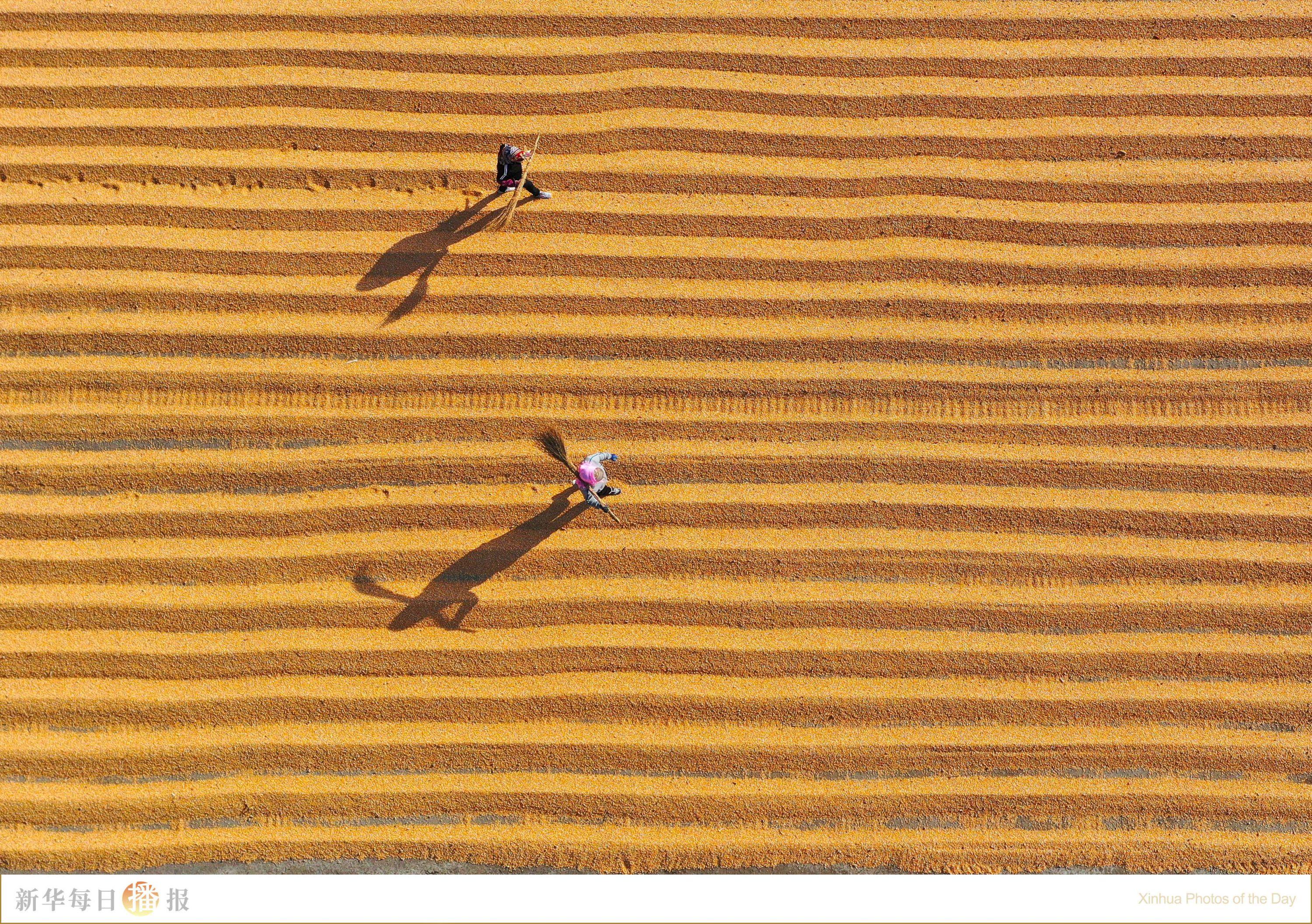 10月28日,在山东省高密市新立屯村一家庭农场,人们在玉米晾晒场忙碌(无人机照片)。金秋时节,多地农民利用晴好天气开展秋收、秋种等工作,确保丰产丰收。