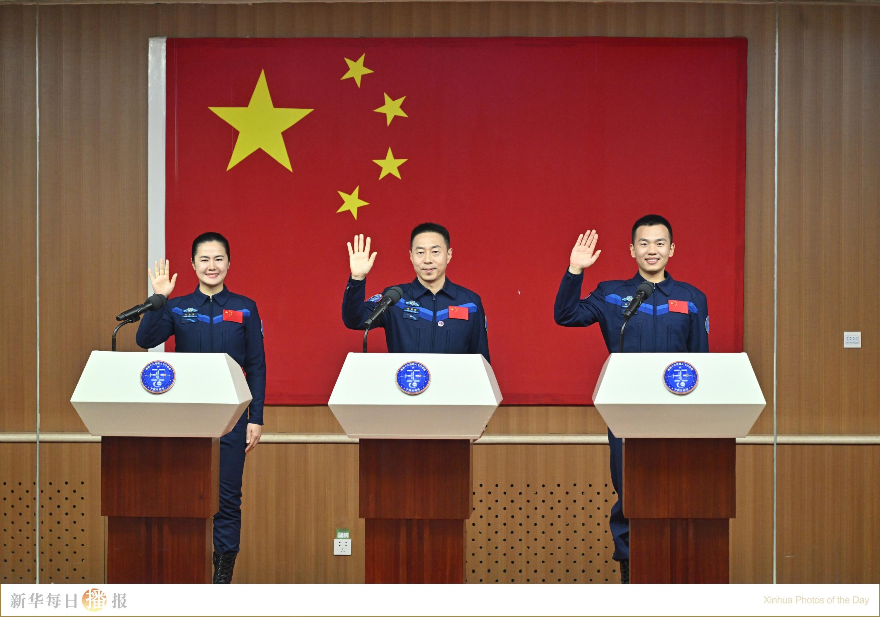 10月29日,神舟十九号载人飞行任务航天员蔡旭哲(中)、宋令东(右)、王浩泽在酒泉卫星发射中心问天阁与媒体记者集体见面。