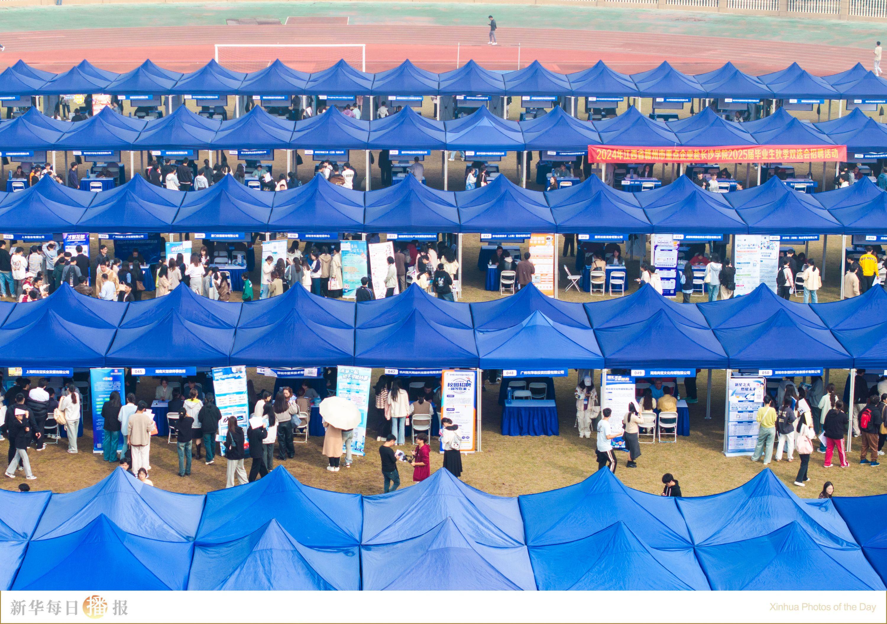 10月29日,长沙学院天健体育场的招聘会现场(无人机照片)。当日,湖南省2025届高校毕业生就业促进月活动在长沙学院启动,同期举办的专场招聘会吸引了全国200余家用人单位,数千名学生参与。