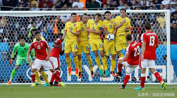 ▲要点一,跳的整齐 :先来看看去年欧洲杯,罗马尼亚队在禁区防守沙奇里弧顶处的一记任意球攻门时,看看来自“喀尔巴千山五壮士”起跳的节奏有多么整齐吧。“大王叫我排人墙啊,我把皮球往外挡,抱住我的胸蹬起额滴腿,人墙充满节奏感...” 最终,沙奇里的任意球就被这么一堵人墙化解。