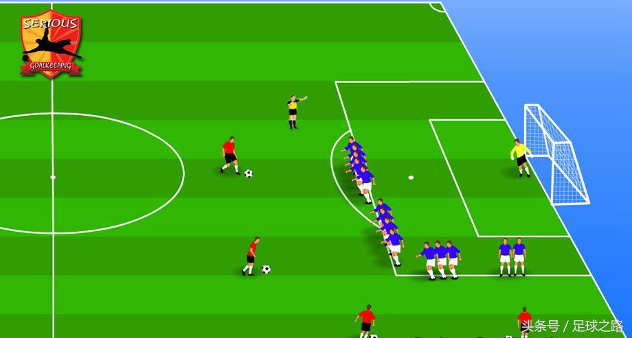 注意!这里不能死板,如果左脚球员右路罚球,门将指挥可以向中路移动,如果右路右脚球员你就要让人墙适当向门柱外侧让出一到两个身位。