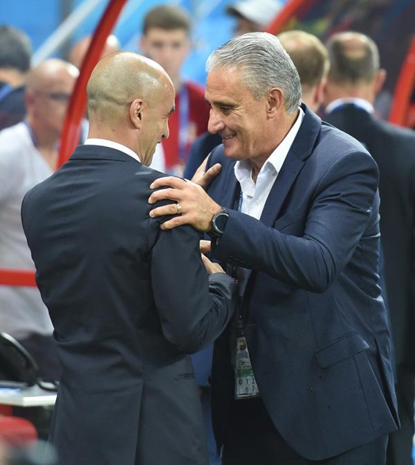 蒂特(右)与比利时队主教练马丁内斯在比赛前互致问候。新华社记者 杜宇 摄