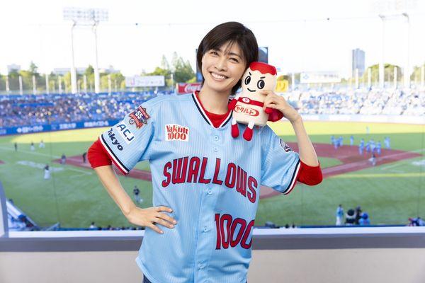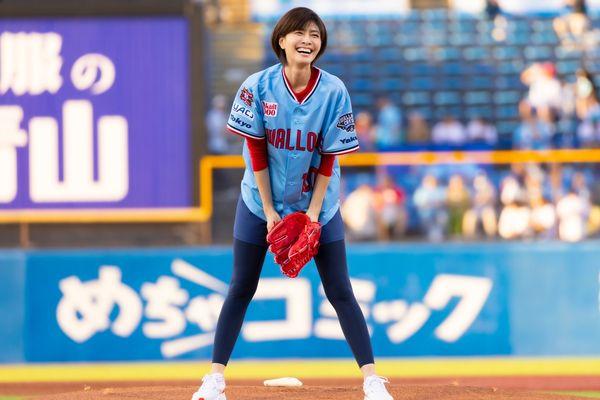 内田有纪身穿「1000」号的球衣登投手丘,一头耳下旁分短法,全程露出灿烂笑容,投球时抬脚架势十足,大腿笔直纤细,球场各个角度的相机疯狂捕捉女神身影,她也一一回应笑颜。