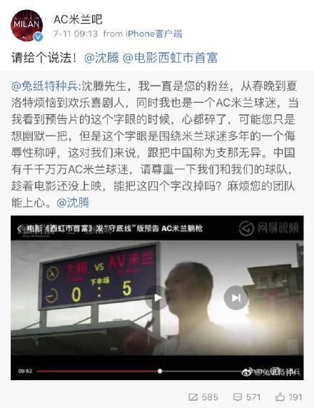 7月11日消息,沈腾主演的《西虹市首富》发布预告片,在足球场上的片段中,电影用AV米兰作为一支球队名称,被AC米兰球迷认为有侮辱嫌疑,引发了骂声一片。
