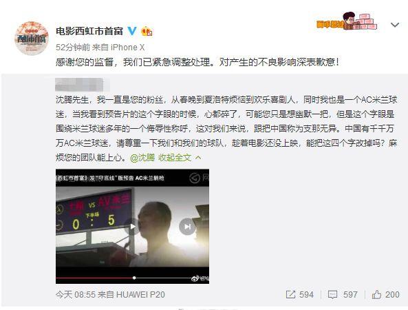 随后,电影《西虹市首富》官微做出回应:感谢您的监督,我们已紧急调整处理。对产生的不良影响深表歉意!