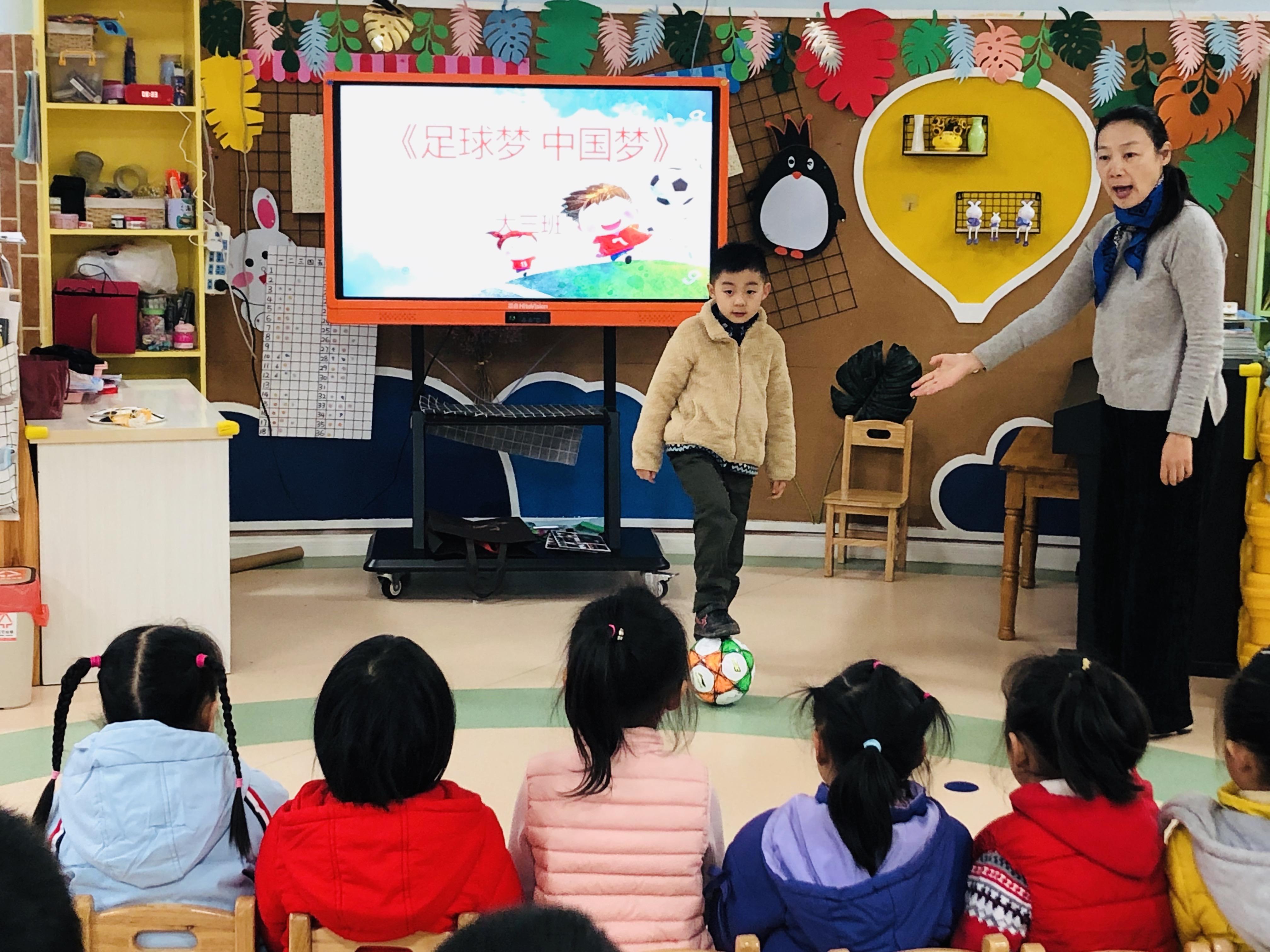 一周的活动中,老师们利用集体教学时间,引导幼儿了解足球的起源,学习足球的玩法和规则,全面普及足球知识。并通过观看《足球梦中国梦》《hey!我的足球梦》《汪星撞足球》等足球励志电影和动画片,形象直观地感受足球给我们生活带来的乐趣,以及足球运动中渗透的坚韧不拔、永不放弃的精神。