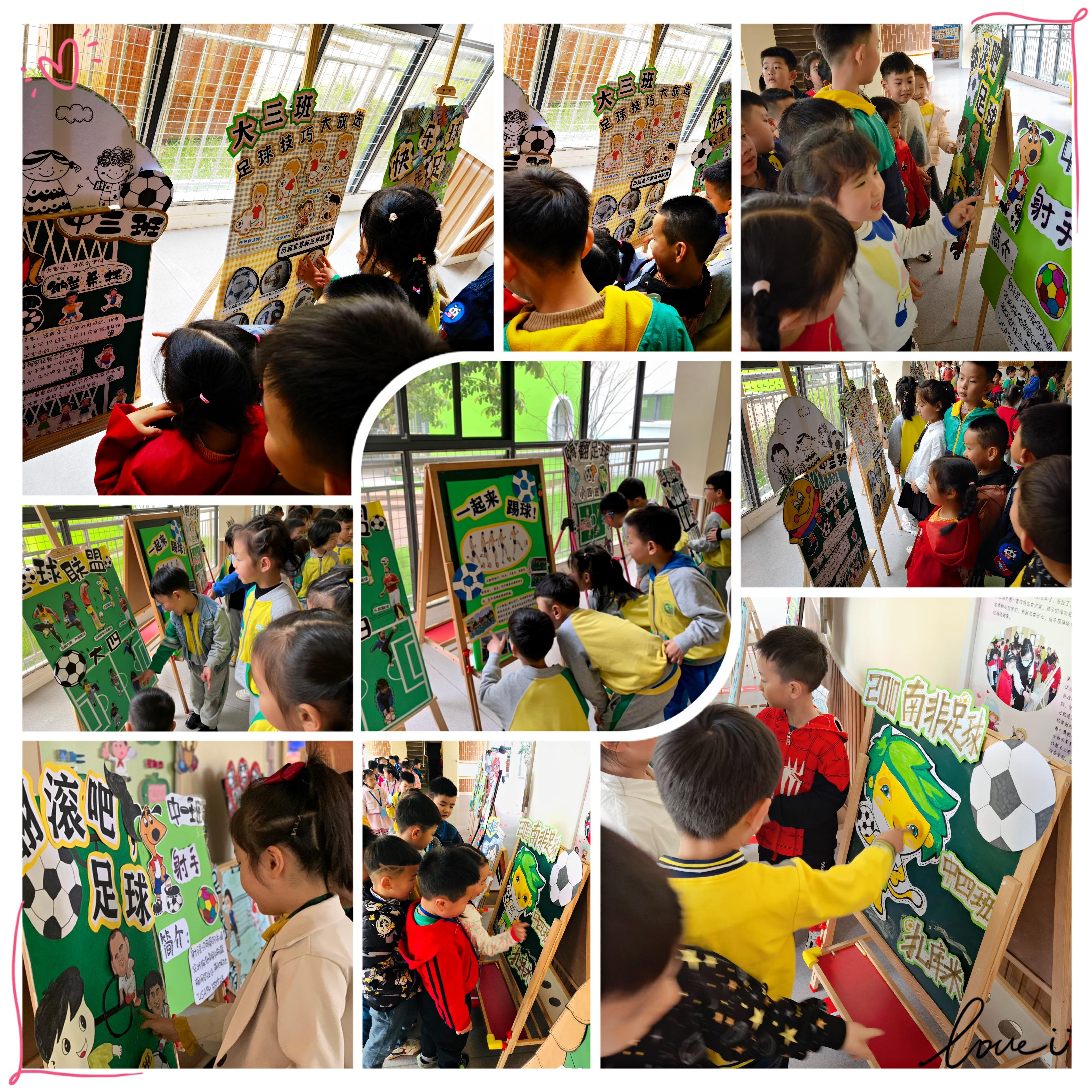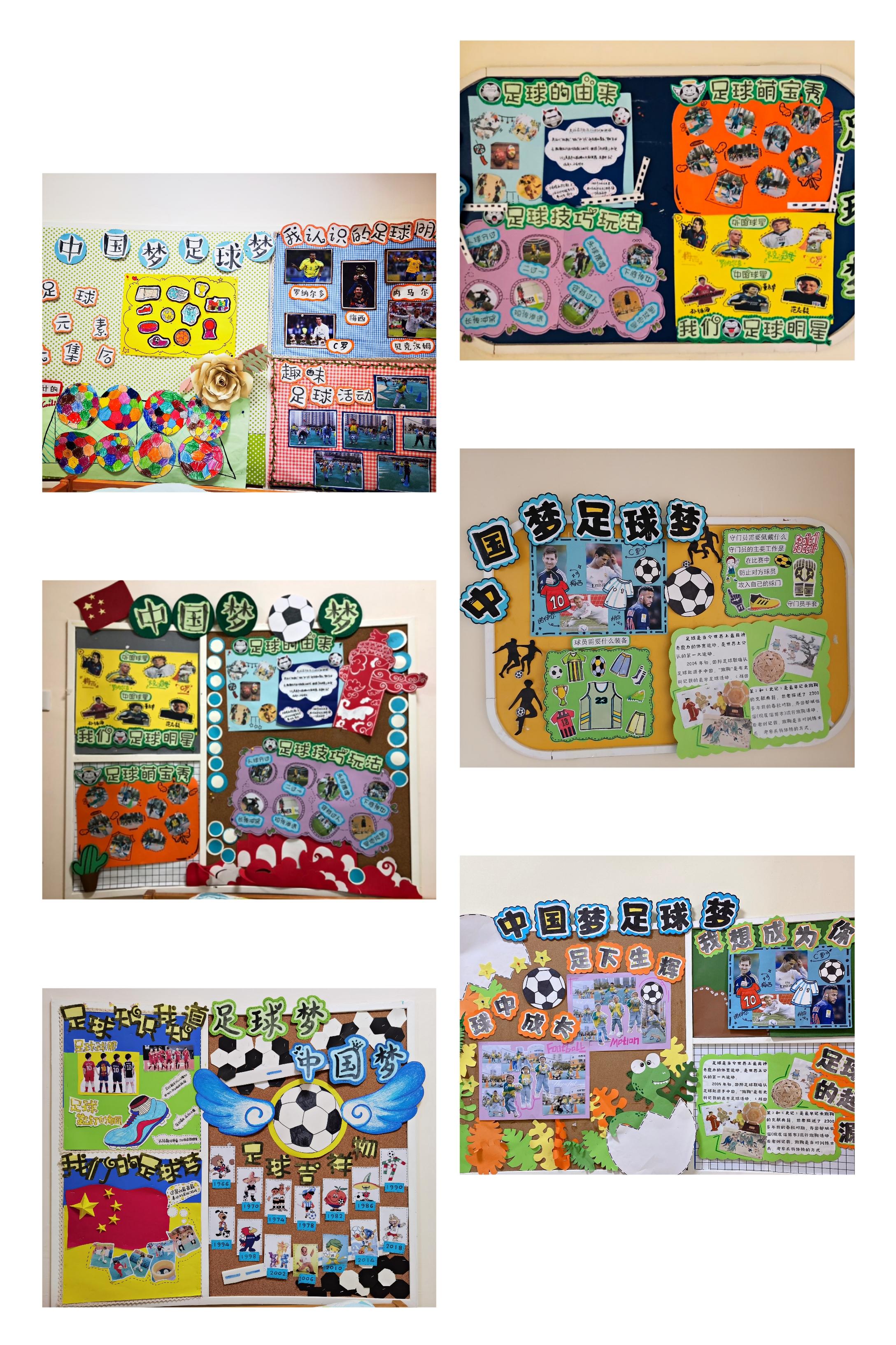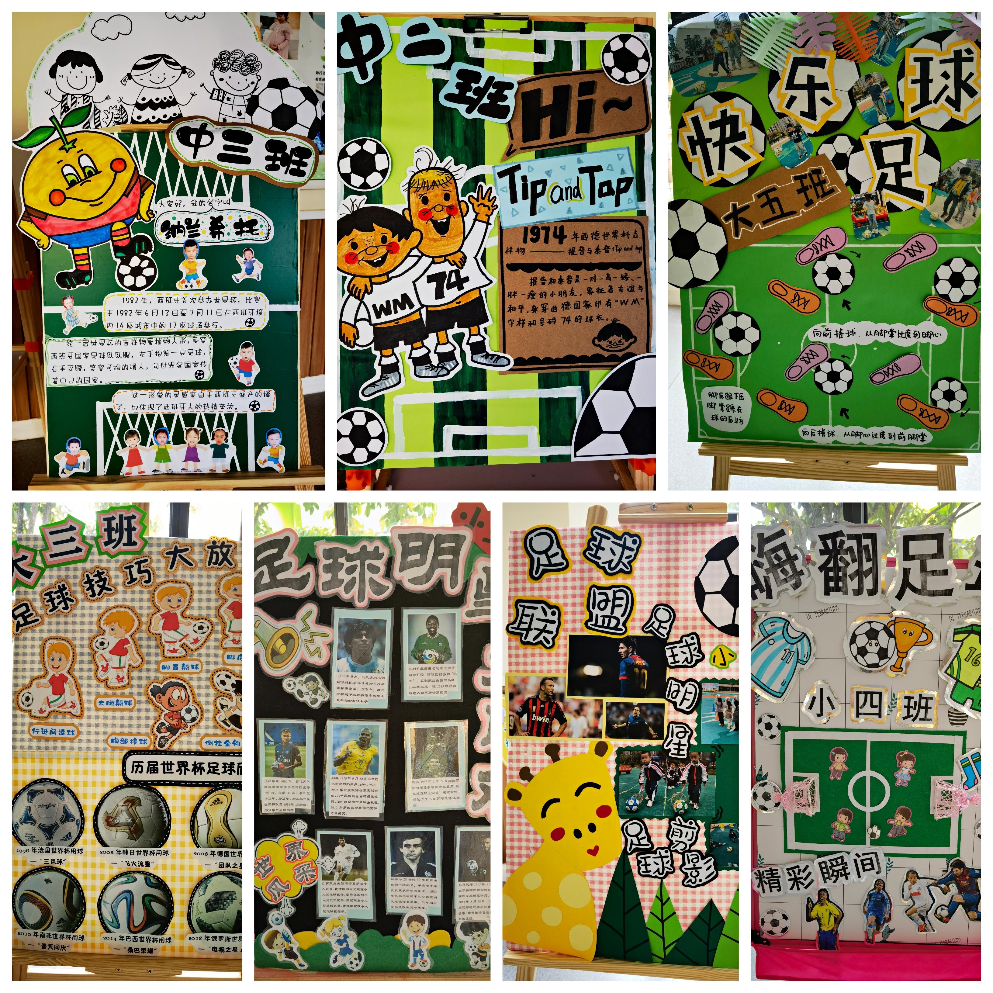幼儿园的教室和大厅更是在老师们的巧手装扮下变成了一场足球盛会,世界闻名的足球明星、历届足球世界杯可爱的吉祥物以及足球技能知识的主题墙和展板,让孩子们了解关于足球的“故事”,感受着足球文化的独特魅力。