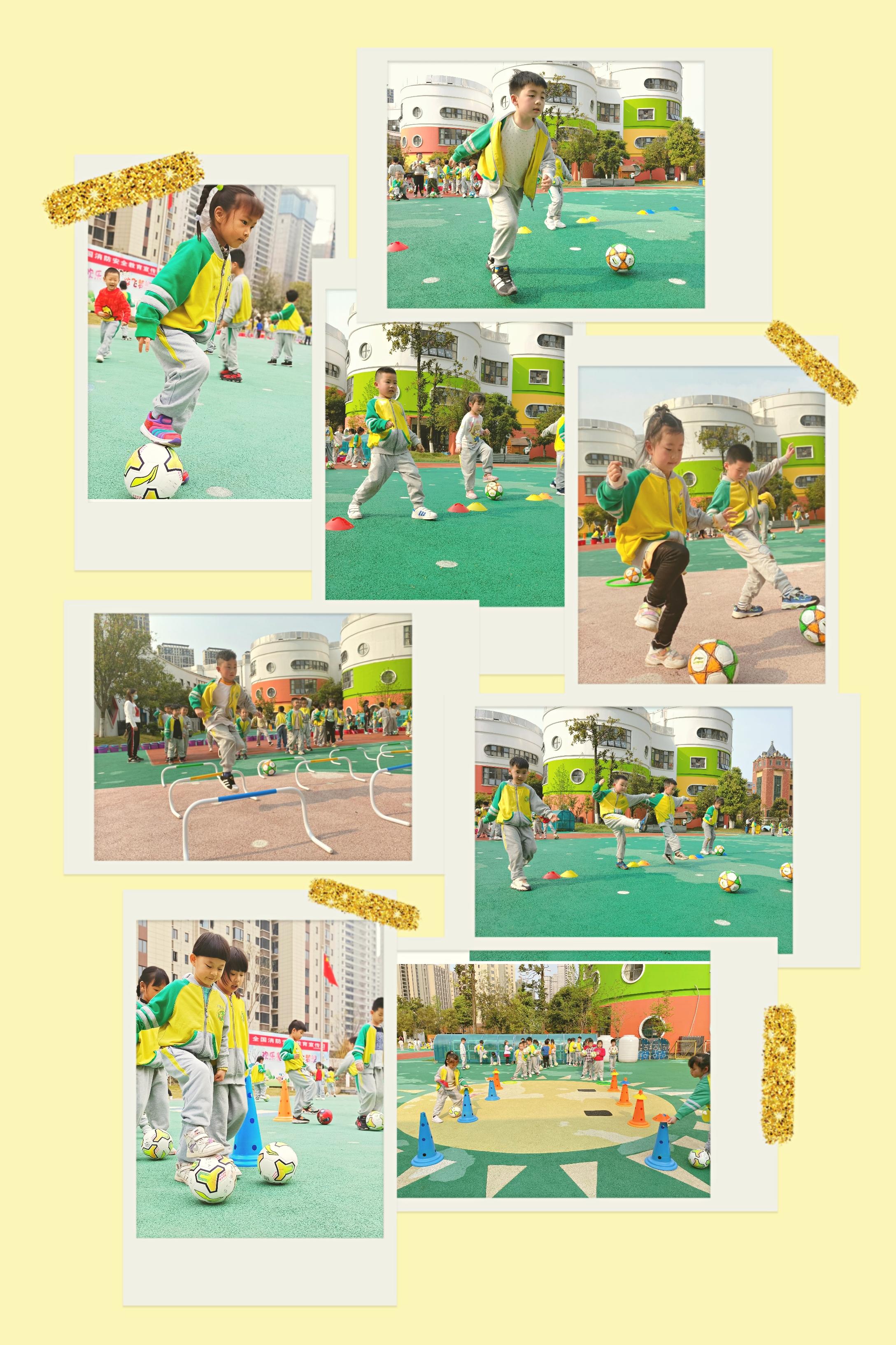 瞧!在宽阔的操场上,孩子们勇敢地挑战各种足球技能,“绝地求生”、“翻山越岭”、“兔宝宝回家”......他们在充满情境、趣味横生的足球游戏中,体验踢足球的快乐,享受着足球游戏的乐趣。