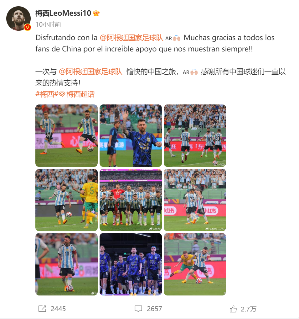 1 蛇形走位,抱到梅西6月15日晚上8点,梅西率领的阿根廷队亮相北京新工人体育场,对阵澳大利亚队。在这场国际友谊赛中,阿根廷队以2:0轻取澳大利亚队。身穿10号球衣的梅西踢满全场,更是在开赛仅81秒就闪电般攻破对方球门。 据阿根廷当地媒体报道,这个进球也是梅西职业生涯中的最快进球。此前的纪录是2018年对阵切尔西时的2分06秒。