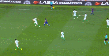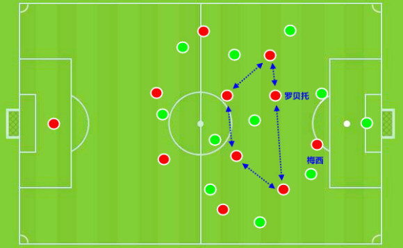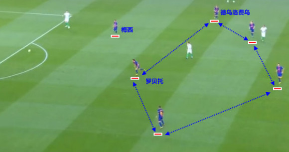 从上图中我们可以看到,4231站位的帕科,德乌洛费乌和罗贝托三人站在梅西身后,不论是进攻还是防守都能在前场形式最大的威胁,前提是对方的皮球在本方半场传导。而在这个高位逼抢中,除了进攻任务繁重的梅西没有参与前场高位压迫之外,罗贝托在一瞬间带动后方队友一起前压,将对方四位后场球员包围在一个半区而出不来,完成一次高效的前场逼抢。