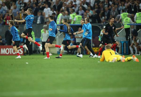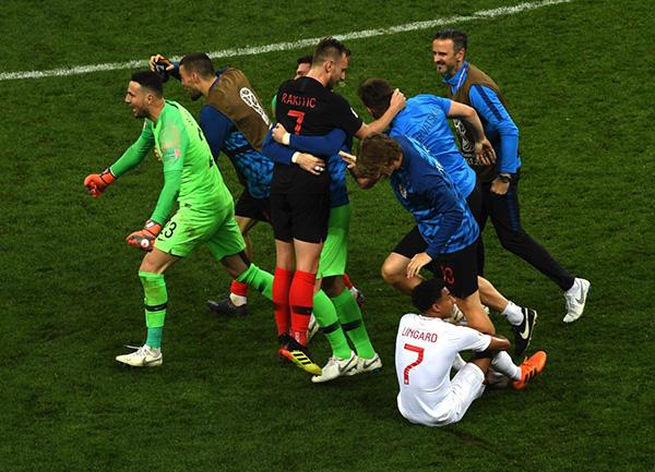 克罗地亚队庆祝胜利,而英格兰队球员情绪低落。