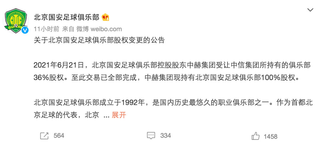 今天,北京国安官方发布消息,俱乐部已经完成了股权变更,中赫集团得到了国安俱乐部的所有股份。投资国安足球俱乐部28年的中信集团正式退出历史舞台。