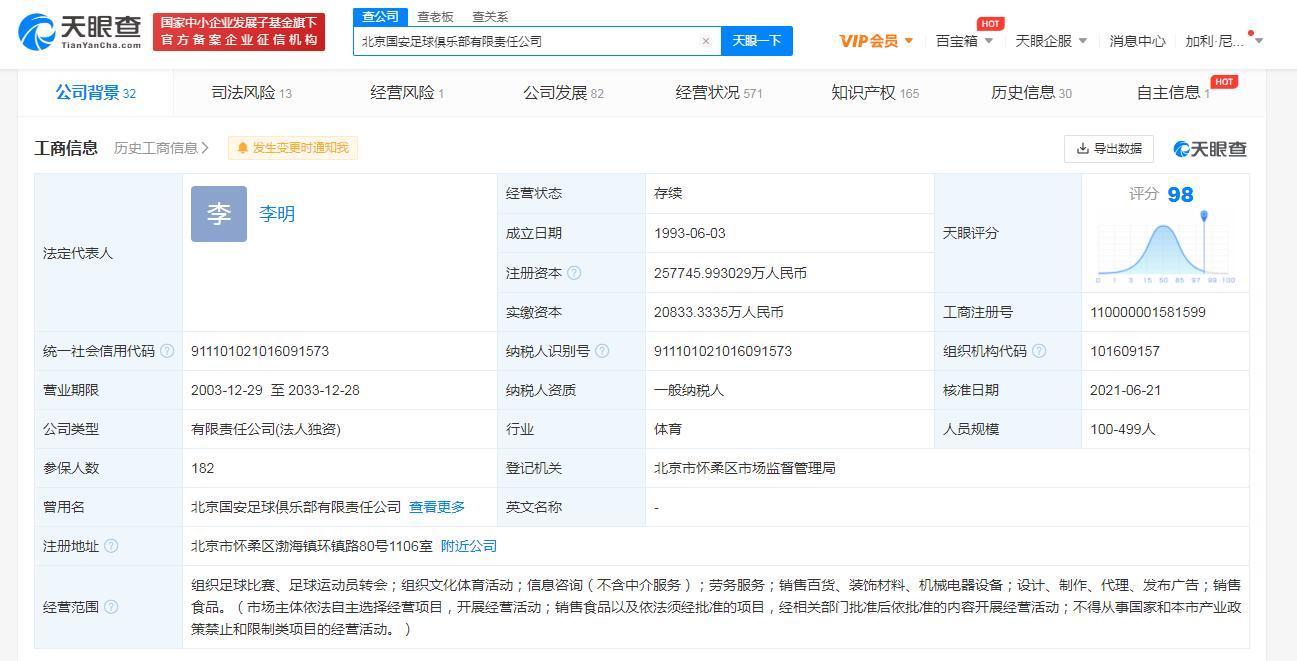 天眼查App显示,6月23日,北京国安足球俱乐部有限责任公司发生多项工商变更,中国中信有限公司从股东中退出,企业法定代表人由周金辉变更为李明。