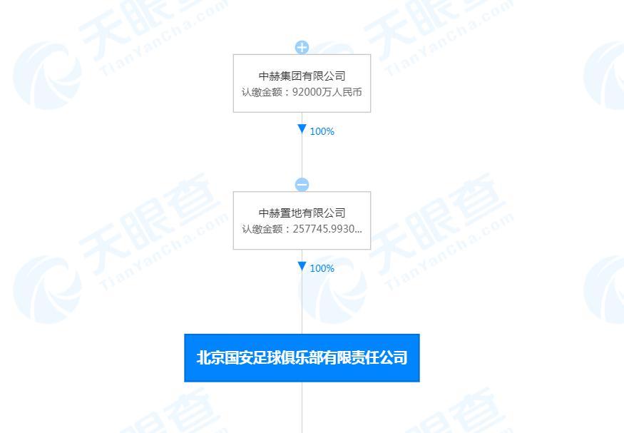 北京国安足球俱乐部有限责任公司成立于1993年6月,注册资本约25.77亿人民币,经营范围含组织足球比赛、足球运动员转会;组织文化体育活动;销售食品等。股东信息显示,该公司由中赫置地有限公司全资持股,后者为中赫集团全资子公司。