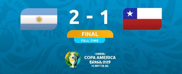 美洲杯三四名决赛,阿根廷迎战智利。上半场“玫瑰组合”心有灵犀阿圭罗单刀破门,桑切斯伤退,迪巴拉扩大比分,梅西和梅德尔爆发冲突双双被红牌罚下;下半场比达尔点射扳回一个。最终,阿根廷2-1智利夺得本届美洲杯季军。