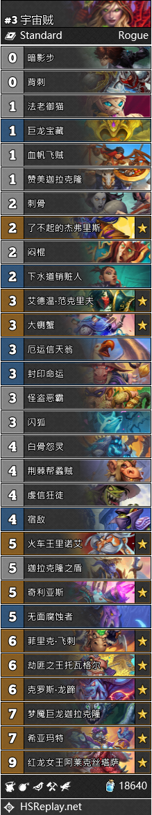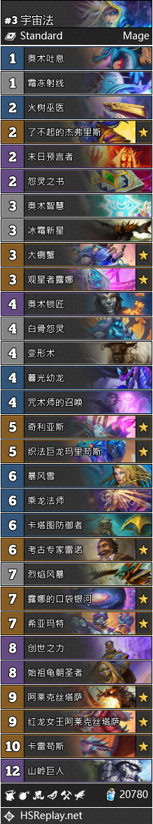 这里推荐的是Jarla直播采用的宇宙法版本。这周的观察结果是对银河的评价更高了,在对抗盗贼的时候银河是一张值得起手留下的牌,没有银河带来的节奏很多对局都会显得非常艰难。老练的盗贼是法师极为棘手的对局,盗贼拥有比法师更多的资源量并且远比法师要好的节奏把控。一般来说冻住盗贼的场面远比解掉场面要来得好,注意呼啦不要随便交,因为盗贼只需要一个鲨鱼之灵就可以迅速重构场面。面对祈求手牌术的时候要盘算好对面解牌的数量来分配自己的资源。