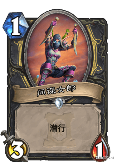 1费的间谍女郎身材不错,能在这个费用有3攻且没有副作用的卡牌还是很少的,虽然她只有1血,但潜行也能在很大程度上保证她的前期站场能力,我们也能更自由的拿到随从的主动交换权,很多时候都是以小换大,对前期节奏的把控能力极强,还和其他卡牌有一定的配合。